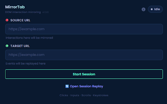 MirrorTab es una extensión gratuita para Chrome que permite replicar en tiempo real las interacciones de una pestaña a otra. Con funciones como el registro de sesiones y la capacidad de exportar datos, es ideal para pruebas de calidad y presentaciones. La extensión captura clics, entradas de texto, desplazamientos y movimientos del ratón, enviándolos instantáneamente a una pestaña objetivo. Además, el usuario puede pausar, reanudar o detener la sesión en cualquier momento, lo que proporciona un control total sobre el proceso.
